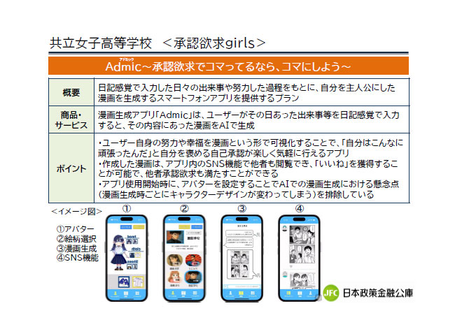 急速に発達しているSNSが持つマイナスの要素を、日本が競争力を有すると言われる漫画で解決した点を高く評価し、共立女子高等学校をグランプリとして選出いたしました。